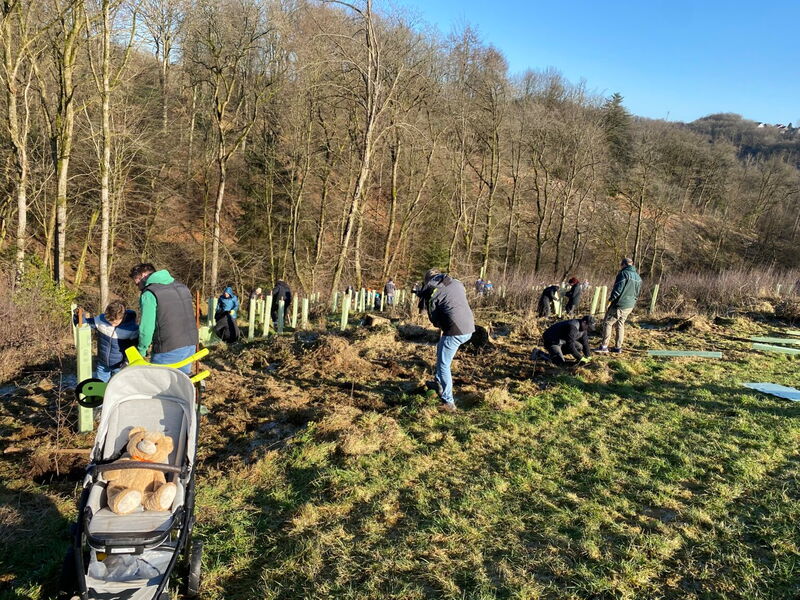 Strahlender Sonnenschein und Temperaturen um den Gefrierpunkt begleiteten die etwa 100 Freiwilligen, die am Samstag, 1. Februar, ausgestattet mit Spaten und viel Elan, einen Wald der Vielfalt pflanzten. Wo vor 4 Jahren noch Fichten im Reinbestand standen, werden nun Roteichen, Esskastanien und Elsbeeren als Hauptbaumarten wachsen. Aus dem natürlichen Samenvorrat im Boden sind schon die ersten Birken, Fichten und Baumhasel gewachsen. Aber auch viel Gras, Adlerfarn und Brombeeren. Gegen diese kampfkräftigen Pflanzen haben Baumkeimlinge es schwer, sich durchzusetzen. Damit im Bergischen Land neue Wälder heranwachsen, die hoffentlich auch unter den Bedingungen des Klimawandels gedeihen, ist es sinnvoll zu helfen. In diesem Fall in Form von Trupppflanzungen mit zusätzlichen Baumarten. Denn die Erfahrung lehrt: vielfältige Bestände aus Laub- und Nadelbäumen sind stabiler - insbesondere bei wechselnden Wetterbedingungen.