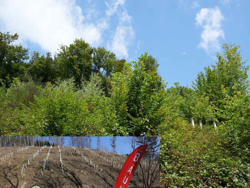 Auf der Overather Pflanzfläche hat sich die Mischung aus 8 verschiedenen Baumarten, ausgewählt nach dem Waldbaukonzept des Landes NRW, offenbar bestens bewährt. Rotbuchen und Traubeneichen bilden den größten Teil des Bestandes; aber auch Vogelkirsche, Esskastanie sowie Douglasie, Weißtanne, Küstentanne und Lärche sind gut gewachsen. Aus dem Samenvorrat im Boden sind noch Fichten, Birken und Buchen hinzugekommen. Im Ergebnis wächst hier ein artenreicher Mischwald aus Neuanpflanzung und Naturverjüngung heran.